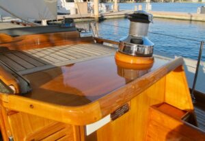 Since 2014, we have been entrusted with maintaining the varnish on this beautiful Morris 34. Even among a dock lined with exceptional boats, she really stands out. Each year, all exterior brightwork is carefully taped off, sanded, and finished with four maintenance…