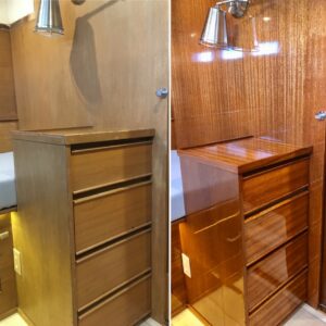 Working closely with the owners, new stain colors were sampled and selected to achieve the desired look. Once approved, stain was applied and built up with a minimum of eight coats of high gloss varnish. Each coat was sanded smooth before the next, resulting in a deep, glossy finish that transformed the interior from dated to modern while preserving the yacht’s classic character.